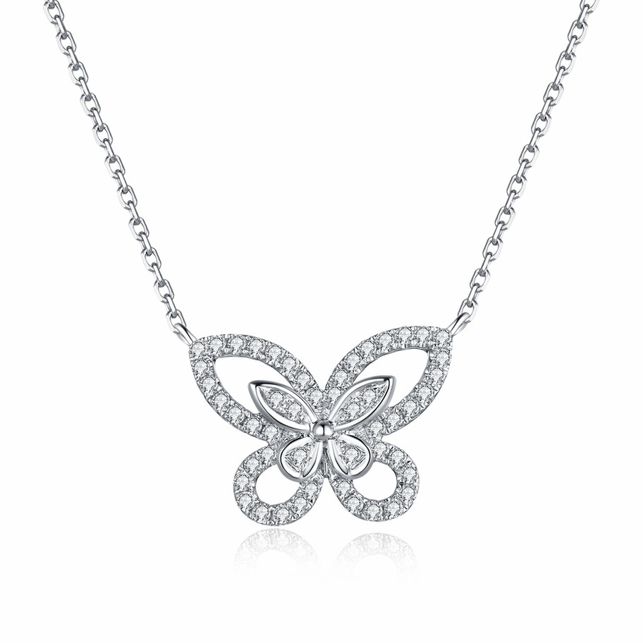 This pendant features a clean butterfly silhouette outlined with lab-created diamonds, combining soft curves with a balanced, open design. The symmetrical shape keeps the look light and composed, with diamonds adding definition without excess weight or bulk.