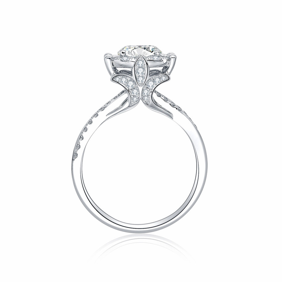 This ring feels like a love story told through fine detail. A brilliant round lab-created diamond shines at the center, surrounded by a classic halo that enhances its sparkle with timeless elegance. Subtle pavé diamonds trace the band and setting, adding depth, texture, and a softly vintage character.